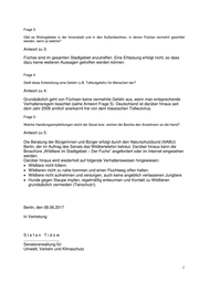 Frage 3: Gibt es Wohngebiete in der Innenstadt und in den Außenbezirken, in denen Füchse vermehrt gesichtet werden, wenn ja welche? Antwort zu 3: Füchse sind im gesamten Stadtgebiet anzutreffen. Eine Erfassung erfolgt nicht, so dass dazu keine weiteren Aussagen getroffen werden können. Frage 4: Stellt diese Entwicklung eine Gefahr (z.B. Tollwutgefahr) für Menschen dar? Antwort zu 4: Grundsätzlich geht von Füchsen keine vermehrte Gefahr aus, wenn man entsprechende Verhaltensregeln beachtet (siehe Antwort Frage 5). Deutschland ist darüber hinaus seit dem Jahr 2008 amtlich anerkannt frei von dem klassischen Tollwutvirus. Frage 5: Welche Handlungsempfehlungen reicht der Senat bzw. reichen die Bezirke den Anwohnern an die Hand? Antwort zu 5: Die Beratung der Bürgerinnen und Bürger erfolgt durch den Naturschutzbund (NABU) Berlin, der im Auftrag des Senats das Wildtiertelefon betreut. Darüber hinaus kann die Broschüre „Wildtiere im Stadtgebiet – Der Fuchs“ angefordert oder im Internet eingesehen werden. Darüber hinaus wird wiederholt auf folgende Verhaltensweisen hingewiesen: Wildtiere nicht füttern. Wildtieren nicht zu nahe kommen und einen Fluchtweg offen halten. Wildtiere nicht aufnehmen und versorgen, auch keine angeblich verlassenen Jungtiere Hunde gegen Staupe impfen, regelmäßig entwurmen und Kontakt zu Wildtieren grundsätzlich vermeiden (Tierschutz!). Berlin, den 08.06.2017 In Vertretung Stefan Tidow ................................ Senatsverwaltung für Umwelt, Verkehr und Klimaschutz 2