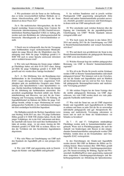 Abgeordnetenhaus Berlin – 17. Wahlperiode Drucksache 17 / 17 201 4. Wie positioniert sich der Senat zu der Auffassung, 9. An welchen Standorten sind in jeweils welcher dass es keine wissenschaftlich haltbare Methode zur si- Platzkapazität UMF gegenwärtig untergebracht (bitte cheren Altersfeststellung gibt? Warum hält der Senat Hostels und andere Sammelunterkünfte gesondert auswei- dennoch an dieser Praxis fest? sen, ebenfalls gesondert auszuweisen sind Einrichtungen, in denen nicht nur UMF untergebracht sind)? Zu 4.: Die medizinischen Altersgutachten, die die für Jugend zuständige Senatsverwaltung beim Centrum für 10. Wer entscheidet nach welchen Kriterien über die Forensische Altersbestimmung (CFAB) Charité/Universi- Eignung der Unterkünfte für die jugendhilfegerechte tätsklinikum Hamburg-Eppendorf (UKE) in Auftrag gibt, Unterbringung von UMF? Welche Standards müssen werden nach den Richtlinien der Arbeitsgemeinschaft für zwingend erfüllt sein? forensische Altersdiagnostik an Universitätskliniken er- stellt. 11. Wie hoch waren die Kosten in den Jahren 2013, 2014 und anteilig 2015 für die Unterbringung von UMF in Hostels/Sammelunterkünften und wonach berechneten 5. Durch wen ist sichergestellt, dass bei der Versagung sich diese? einer Inobhutnahme wegen nichtanerkannter Minderjäh- rigkeit der junge Mensch über die Möglichkeit einer Be- 12. Wie und durch wen gewährleistet der Senat in den antragung einer Hilfe für junge Volljährige gemäß § 41 Hostels/Sammelunterkünften die pädagogische Betreuung SGB VIII auch in seiner Sprache umfassend informiert der UMF sowie den Kinderschutz? und er rechtlich beraten wird? 13. Welches Konzept liegt der mobilen pädagogischen 6. Wie viele nach Meinung des Senats junge volljähri- Betreuung von UMF in Hostels/ Sammelunterkünften ge Flüchtlinge haben seit dem 01.01.2015 einen Antrag zugrunde? auf Hilfe für junge Volljährige gemäß § 41 SGB VIII gestellt und wie wurden diese Anträge beschieden? 14. Wie oft in der Woche für jeweils welche Zeitdauer werden UMF in Hostels/ Sammelunterkünften individuell Zu 5. - 6.: Der Ablehnung bzw. der Beendigung einer pädagogisch betreut? Wer kümmert sich in der Zwischen- Inobhutnahme in der Erstaufnahme- und Clearingstelle zeit um die Kinder und Jugendlichen auch im Hinblick (EAC) wegen altersgeschätzter bzw. eingetretener Voll- auf den Kinderschutz und wie wird im Not- bzw. Krisen- jährigkeit geht ein ausführliches Gespräch unter Einbe- fall pädagogische Betreuung/Intervention und medizini- ziehung einer Sprachmittlerin / eines Sprachmittlers vo- sche Versorgung gesichert? raus. Der/die betroffene Geflüchtete wird über die Gründe für die Ablehnung der Inobhutnahme unterrichtet. Der 15. Mit welchen Trägern hat der Senat Verträge über persönlich ausgehändigte Bescheid enthält eine Rechts- die mobile pädagogische Betreuung von UMF abge- mittelbelehrung und Hinweise, wer jetzt für die Unter- schlossen, wie viele UMF werden durch wie viele päda- bringung und Versorgung zuständig ist. Die Klärung, ob gogische Fachkräfte mobil betreut? Jugendhilfebedarf im Rahmen der Hilfen für junge Voll- jährige besteht, erfolgt in enger Abstimmung der sozial- 17. Was wird der Senat tun, um als UMF eingereiste pädagogischen Fachkräfte in den Aufnahmeeinrichtungen Kinder und Jugendhilfe nach Jugendhilferecht in Obhut mit dem zuständigen bezirklichen Jugendamt. zu nehmen und ihnen zu jeder Zeit die für sie notwendige individuelle pädagogische und ggf. therapeutische Be- Die Halbjahresstatistik der Berliner Jugendämter weist treuung und medizinische Versorgung zukommen zu zum Stichtag 30.06.2015 aus, dass 276 junge Geflüchtete lassen und sie auch im Sinne des Kinderschutzes vor Hilfen gemäß § 41 SGB VIII erhalten haben. Da die Zahl Schaden zu bewahren? junger Volljähriger, die in der EAC ankommen und derer, die innerhalb sehr kurzer Zeit nach ihrer Inobhutnahme 18 Zu 7. - 15. und 17.: Unbegleitete minderjährige Jahre alt werden, steigt, ist mit einem Anstieg der Hil- Flüchtlinge werden nicht in Sammelunterkünften unter- febedarfe gemäß § 41 SGB VIII zu rechnen. Hierzu wer- gebracht. Wenn sich in Flüchtlingsgruppen, die nach der den die Verfahren mit den bezirklichen Jugendämtern Ankunft von Sonderzügen oder Bussen in den entspre- abgestimmt. chenden Sammelunterkünften untergebracht werden UMF befinden, werden diese an die Erstaufnahme- und Clea- ringstelle (EAC) weitergeleitet. 7. Wie viele Plätze zur Unterbringung von UMF nach den Standards der Jugendhilfe gibt es zum jetzigen Zeit- In den Einrichtungen der Kinder-und Jugendhilfe punkt? werden derzeit 586 UMF im Rahmen der Hilfen zur Er- ziehung betreut. Hinzu kommen über 1000 Plätze gemäß 8. Wie viele UMF sind gegenwärtig nicht in Einrich- § 42 SGB VIII in temporäre Unterbringungseinrichtun- tungen der Kinder- und Jugendhilfe untergebracht? gen. Die Senatsverwaltung für Bildung, Jugend und Wis- senschaft (SenBildJugWiss) nutzt gegenwärtig ergänzend diese temporären Unterbringungseinrichtungen und Be- herbergungsbetriebe zur Abfederung der Spitzenlastsitua- 2