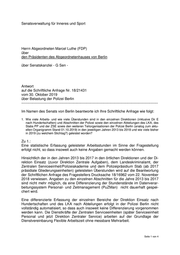 Senatsverwaltung für Inneres und Sport Herrn Abgeordneten Marcel Luthe (FDP) über den Präsidenten des Abgeordnetenhauses von Berlin über Senatskanzlei - G Sen - Antwort auf die Schriftliche Anfrage Nr. 18/21431 vom 30. Oktober 2019 über Belastung der Polizei Berlin ----------------------------------------------------------------------------------------------------------------- Im Namen des Senats von Berlin beantworte ich Ihre Schriftliche Anfrage wie folgt: 1. Wie viele Arbeits- und wie viele Überstunden sind in den einzelnen Direktionen (inklusive Dir E nach Hundertschaften) und Abschnitten der Polizei sowie den einzelnen Abteilungen des LKA, des Stabs PP und der ZSE sowie den weiteren Teilorganisationen der Polizei Berlin (analog zum aktu- ellen Organigramm Stand 01.10.2019) in den jeweiligen Jahren 2013 bis 2018 und wie viele bisher in 2019 (zu welchem Stichtag?) geleistet worden? Zu 1.: Eine statistische Erfassung geleisteter Arbeitsstunden im Sinne der Fragestellung erfolgt nicht, so dass insoweit auch keine Angaben gemacht werden können. Hinsichtlich der in den Jahren 2013 bis 2017 in den örtlichen Direktionen und der Di- rektion Einsatz (zuvor Direktion Zentrale Aufgaben), dem Landeskriminalamt, der Zentralen Serviceeinheit/Polizeiakademie und dem Polizeipräsidium Stab (ab 2017 präsidiale Gliederungseinheiten) geleisteten Überstunden wird auf die Beantwortung der Schriftlichen Anfrage des Fragestellers Drucksache 18/16962 vom 22. November 2018 verwiesen. Angaben zu den einzelnen Abschnitten für die Jahre 2013 bis 2017 sind nicht mehr möglich, da eine Differenzierung der Stundenstände im Datenverar- beitungssystem Personal- und Zeitmanagement (PuZMan) nicht dauerhaft gespei- chert wird. Eine differenzierte Erfassung der einzelnen Bereiche der Direktion Einsatz nach Hundertschaften und des LKA nach Abteilungen erfolgt in der Polizei Berlin nicht vollständig automatisiert, so dass auch insoweit keine Differenzierung vorgenommen werden kann. Die Dienstkräfte der Zentralen Serviceeinheiten (später Serviceeinheit Personal und jetzt Direktion Zentraler Service) arbeiten auf der Grundlage der Dienstvereinbarung Flexible Arbeitszeit ohne messbare Mehrarbeit. Seite 1 von 4