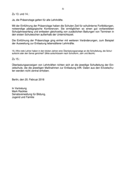 -3- Zu 5.: Nach § 3 Absatz 2 MVergV wird die Vergütung höchstens bis zu 480 Mehrarbeitsstunden im Kalenderjahr gewährt, wobei 24 Unterrichtsstunden als 40 Mehrarbeitsstunden gelten (§ 5 Absatz 2 Nr. 2 MVergV). 6.) Zu wie vielen Stunden dürfen teilzeitbeschäftigte Lehrer in der Summe ihrer Tätigkeiten (Unterricht, Vor- und Nachbereitung des Unterrichts, Teilnahme an Klassen- und Schulkonferenzen, Elterngespräche, Vertre- tungsstunden etc., aber auch Funktionstätigkeiten) zur Dienstleistung herangezogen werden? Zu 6.: Teilzeitbeschäftigte Lehrkräfte werden entsprechend ihrer individuellen Teilzeitquote zur Dienstleistung herangezogen. Die Stundenanzahl richtet sich nach der jeweiligen Teilzeit- quote. 7.) Wird der Teilzeitquote bei Übertragung von Funktionstätigkeiten in Berlin konsequent Rechnung getra- gen? Erfolgt ein zeitlicher Ausgleich durch entsprechend geringere Heranziehung zu anderen Aufgaben? Zu 7.: Den Schulleitungen wurde eine Handlungsempfehlung zur Verfügung gestellt, um teilzeit- beschäftigte Lehrkräfte anteilig zu entlasten. Dies schließt auch Funktionsstelleninhabe- rinnen/Funktionsstelleninhaber ein. 8.) Welche Konsequenzen zog der Senat aus dem Urteil des Bundesverwaltungsgerichts vom 16. Juli 2015 (BVerwG 2 C 16.14) Zu 8.: Den Schulleitungen wurde eine Handlungsempfehlung zur Verfügung gestellt, um teilzeit- beschäftigte Lehrkräfte anteilig zu entlasten. 9.) Welche Anreize wurden in Berlin für Teilzeitkräfte, ihr Stundenvolumen zu erhöhen, geschaffen? 12.) Plant der Senat die Mindestverpflichtung für Teilzeitkräfte zu erhöhen? Wenn ja: auf wieviel Prozent des normalen Stundendeputats? Zu 9. und 12.: Gegenwärtig wird der Umfang der Teilzeitbeschäftigung von Lehrkräften, soweit diese nicht aus familienpolitischen Gründen oder zur Pflege von Angehörigen in Anspruch ge- nommen wird, näher betrachtet. Hierzu liegen derzeit keine Ergebnisse vor. 10.) Welche Anreize will der Senat für Teilzeitkräfte, ihr Stundenvolumen zu erhöhen, schaffen? Zu 10.: Es gibt keine Planungen zu einem Anreizsystem zur Erhöhung des Stundenvolumens von Teilzeitkräften.