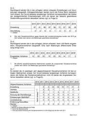 2010 2011 2012 2013 2014 2015 2016 2017 2018* Einstellungen 923 888 869 959 1005 828 924 784 523 Verurteilungen 39 31 19 10 18 22 24 16 11 * 1. Halbjahr 3. Mit welchen disziplinarrechtlichen Maßnahmen endeten die in der Drs. 18/16371 genannten Disziplinarverfahren (bitte nach Jahr und Maßnahme gesondert darstellen)? Zu 3.: Die 1.673 abgeschlossenen Disziplinarverfahren gliedern sich in folgende Maßnah- men: 2010 2011 2012 2013 2014 2015 2016 2017 2018* Einstellung 152 152 132 133 121 120 128 107 58 Verweis 20 27 25 25 13 36 33 21 19 Geldbuße 41 35 27 26 20 14 11 10 11 Kürzung der Dienstbezüge 9 14 5 5 12 3 3 5 1 Entlassungen BaW/BaP** 0 10 18 10 6 8 11 9 0 Zurückstufung 1 0 2 0 0 0 0 0 0 Entfernung/VerlustBeamten- Rechte*** 5 5 2 1 4 2 1 4 0 * 1. Halbjahr ** Beamte auf Widerruf/Beamte auf Probe *** Verlust der Beamtenrechte 4. Wie viele strafrechtliche Ermittlungsverfahren wurden seit dem Jahr 2010 gegen Beamte des Landeskriminalamtes geführt (erbitte nach Jahren und Abteilungen gesonderte Darstellung)? Zu 4.: Die Polizei Berlin erhebt keine Statistik zu den gegen Beamtinnen und Beamte ge- führten Ermittlungsverfahren. Die gegen Dienstkräfte des Landeskriminalamts (LKA) Berlin bekannt gewordenen Strafverfahren sind der folgenden Tabelle zu entnehmen. Eine nach Abteilungen differenzierte Erfassung erfolgt nicht. 2010 2011 2012 2013 2014 2015 2016 2017 2018* Strafverfahren LKA 66 67 91 80 97 74 61 45 31 * 1. Halbjahr 5. In wie vielen der vorgenannten Strafermittlungsverfahren wurde a. das Ermittlungsverfahren eingestellt, b. Anklage erhoben, a. erfolgte eine Verurteilung? Seite 2 von 4