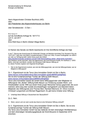 Senatsverwaltung für Wirtschaft, Energie und Betriebe Herrn Abgeordneten Christian Buchholz (AfD) über den Präsidenten des Abgeordnetenhauses von Berlin über Senatskanzlei – G Sen – Antwort auf die Schriftliche Anfrage Nr. 18/11713 vom 4. Juli 2017 über Eine-Welt-Haus in Berlin (Global Village Berlin) ----------------------------------------------------------------------------------------------------------------------------------- Im Namen des Senats von Berlin beantworte ich Ihre Schriftliche Anfrage wie folgt: In der 7. Sitzung des Ausschusses für Wirtschaft, Energie und Betriebe berichtete Frau Senatorin Pop am 19.07.2017, dass das Land Berlin Investitionskosten in Höhe von 3 Mio. € sowie Fördergelder von 200k € pro Jahr zur Verfügung stellt. (siehe hierzu auch den Artikel: https://facettenneukoelln.wordpress.com/2017/06/18/einewelthaus-global_village-berlin-neukoelln/) Des Weiteren wurde informiert, dass die Eigentümerin des Kindl-Brauerei-Areals, Am Sudhaus 2, 12053 Berlin, nicht das Land Berlin, sondern die Schweizer Edith Maryon Stiftung ist. Zu diesen Punkten ergeben sich folgende Einzelfragen: 1. Wer ist die Eigentümerin konkret, wer sind die Stiftungsgründer, wer sind die Stiftungsinhaber, wer ist Mitglied im Stiftungsrat? Zu 1.: Eigentümerin ist die Terra Libra Immobilien GmbH mit Sitz in Berlin: www.maryon.ch/foundation/terra-libra-immobilien-gmbh/#WWXue0dpRaQ. Sie ist eine hundertprozentige Tochter der Stiftung Edith Maryon. www.maryon.ch/foundation/about/#WWXu0EdpRaQ Terra Libra Immobilien besitzt als GmbH keine Stiftungsgründer oder Mitglieder im Stiftungsrat. Die „Mutter“-Stiftung Edith Maryon zur Förderung sozialer Wohn- und Arbeitsstätten wurde 1990 aus einem Kreis junger Menschen heraus gegründet, die zuvor mehrere Jahre lang über soziale Grundsatzfragen nachgedacht und diskutiert haben. Mitglieder des Stiftungsrats sind Thomas Bieri, Rembert Biemond, Dr. Oliver Conradt, Christoph Langscheid und Michael Riggenbach. Es gibt keine Inhaber einer Stiftung. 2. Unterliegt diese Stiftung in Deutschland der Steuerpflicht? Zu 2.: Nein. 3. Wann, warum und von wem wurde das Areal an eine Schweizer Stiftung verkauft? Zu 3.: Eigentümerin ist die Terra Libra Immobilien GmbH mit Sitz in Berlin. Sie ist eine hundertprozentige Tochter der Stiftung Edith Maryon. Die Terra Libra Immobilien GmbH hat das Gelände mit dem ehemaligen Wohlfahrtshaus und dem ehemaligen Verwaltungsgebäude der Kindl-Brauerei im September 2016 erworben.