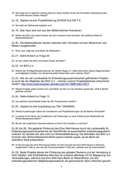 18. Wie lange und in welchem Umfang plant der Senat darüber hinaus die finanzielle Unterstützung des Eine-Welt-Hauses (Global Village)? Zu 18.: Geplant ist eine Projektförderung 2018/2019 je 200 T €. 19. Wie sieht der Refinanzierungsplan aus? Zu 19.: Das Haus wird sich aus den Mieteinnahmen finanzieren. 20. Zahlen die NGO und andere Nutzer, die sich in diesem Areal einmieten, die ortübliche Miete für Gewerbetreibende? Zu 20.: Die Mietkonditionen werden zwischen dem Vermieter und den Mieterinnen und Mietern ausgehandelt. 21. Wenn nein, trägt das Land Berlin die Mietkosten? Zu 21.: Siehe Antwort zu Frage 20. 22. An wen zahlen die NGO und andere Nutzer die Miete? Zu 22.: An BGV e.V.. 23. Welche der 35 Mitgliedsorganisationen der Global Village e.V. (http://www.berlin-global-village.de/ueber- uns/mitglieder/) erhalten vom Senat finanzielle Fördermittel und in welcher Höhe? Zu 23.: Alle von der Landesstelle für Entwicklungszusammenarbeit geförderten Projekte – so auch die der Mitglieder des BGV e.V. – können unserer Projektdatenbank entnommen werden: http://nord-sued-bruecken.de/index.php?id=158&f=0&m=2017. 24. Welche Projekte sollen konkret vom Land Berlin mit den von der Senatorin genannten 200k € jährlich gefördert werden? Zu 24.: Siehe Antwort zu Frage 13. 25. Aus welchem Haushaltstitel sollen die 200 T€ genommen werden? Zu 25.: Geplant ist eine Auszahlung aus Titel 1350/68542. 26. Welche Auswirkungen haben die Investitionen und Projektförderungen auf die Berliner Wirtschaft? 27. In welcher Form führen die Investitionen und Förderungen zu einer Erhöhung der Attraktivität des Wirtschaftsstandorts Berlin? 28. Mit wie viel zusätzlichen Steuereinnahmen ist durch die Investition zu rechnen? Zu 26. bis 28.: Die geplante Förderung des Eine-Welt-Hauses durch die Landesstelle für Entwicklungszusammenarbeit bei der SenWiEnBe ist ausschließlich entwicklungspolitisch motiviert. Es handelt sich also nicht um Wirtschaftsförderung. Die Aktivitäten des BGV e.V. kommen dem Wirtschaftsstandort Berlin jedoch indirekt zugute, da sie Berlin als weltoffene Stadt präsentieren. 29. Ist das Konzept des Eine Welt Hauses Berlin mit dem Konzept des Eine Welt Hauses in München vergleichbar? Falls ja, was sind die Gemeinsamkeiten? Falls nein, welches sind die Unterschiede? Zu 29.: Beide Projekte dienen der Förderung des globalen Denkens und der Vernetzung in ihren Städten. Das EineWeltHaus München ist zunächst allerdings Ort für Begegnung und Veranstaltungen, während das Eine-Welt-Haus Berlin im Wesentlichen von den entwicklungspolitischen Mitgliedsorganisationen als gemeinsamer (Büro-)Standort genutzt 3