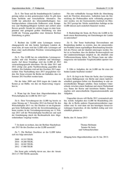 Abgeordnetenhaus Berlin – 17. Wahlperiode Drucksache 17 / 11 334 Zu 4.: Der Senat und die brandenburgische Landesre- Für eine verbindliche Aussage bleibt die Abrechnung gierung stehen zu dem gemeinsamen Labor. Es gibt dazu nach der Preisliste abzuwarten. Außerdem kann die Ent- keine fachliche und wirtschaftliche Alternative. Das wicklung der Probenzahlen nicht vollständig prognosti- LLBB hat anlässlich des lebensmittelbedingten Aus- ziert werden, wie der Gastroenteritis-Ausbruch im Okto- bruchgeschehens (chinesische Erdbeeren) seine Kompe- ber 2012 gezeigt hat. Solche zusätzlichen Aufträge an das tenz und Handlungsfähigkeit fachlich und zeitlich unter LLBB müssen auch zusätzlich finanziert werden. Beweis gestellt. Gerade bei solchen Lagen ist einer kom- petenten und genügend großen Einrichtung wie dem LLBB der Vorrang gegenüber einer kleineren Berliner 8. Beabsichtigt der Senat, die Preise des LLBB in Zu- Einrichtung zu geben. kunft einem Benchmarking mit Einrichtungen der Länder zu unterziehen? 5. Rechnet das LLBB seine Leistungen verursa- Zu 8.: Der Senat beabsichtigt Einvernehmen mit chungsgerecht mit den beiden beteiligten Ländern ab, Brandenburg darüber zu erzielen, dass die umsatzstärks- wenn nein, ab wann wird das LLBB seine Leistungen auf ten Produkte einem regelmäßigen Benchmarking hinsicht- Basis einer nachvollziehen Preisliste verursachungsrecht lich des Preises und der Qualität unterzogen werden. Da- abrechnen? bei ist zu beachten, dass ein direkter Kostenvergleich nur mit Ländereinrichtungen möglich ist, die ebenfalls eine Zu 5.: Das LLBB hat ein einheitliches Leistungsver- Vollkostenrechnung haben. Im Übrigen kann nur nähe- zeichnis und eine Preisliste erarbeitet und bekanntge- rungsweise mit kameralen Vergleichszahlen operiert wer- macht. Auf dieser Grundlage wird das LLBB ab 2013 den. verursachungsgerecht abrechnen. Für die Jahre 2011 und 2012 erfolgt eine grobe Nachberechnung gegenüber den Ländern. Ein Guthaben wird auf den Zuschuss 2013 ange- 9. Gibt es Aufgaben, die im LLBB nur für eines der rechnet. Eine Nachzahlung muss 2013 ausgeglichen wer- beiden Länder bearbeitet werden? den. Der Senat erwartet für Berlin ein Guthaben, dass im Sommer 2013 beziffert werden kann. Zu 9.: Es liegt in der Natur der Sache, dass Leistungen in einem Ballungsraum wie Berlin und einem landwirt- Für die Jahre 2009 und 2010 tragen die Länder die schaftlich geprägten Gebiet wie Brandenburg in sehr un- Kosten je zur Hälfte, wie dies im Staatsvertrag vorgese- terschiedlichen Mengen anfallen. Dazu kommen Unter- hen ist. schiede zwischen einem Stadtstaat und einem Flächenland (u.a. Status der Kreise und kreisfreien Städte). Daraus ergeben sich unterschiedliche Organisationsmodelle und 6. Wann legt der Senat dem Abgeordnetenhaus den Aufgaben. Wirtschaftsplan des LLBB für 2013 vor? Ungeachtet dessen will Berlin 2013 systematisch prü- Zu 6.: Dem Verwaltungsrat des LLBB lag bereits zu fen, welche Aufgaben dass LLBB für Brandenburg erle- seiner Sitzung am 7. November 2012 ein Entwurf für den digt, die in Berlin anderen Organisationseinheiten zuge- Wirtschaftsplan 2013 vor. Der Direktor ist um Ergänzun- ordnet sind. Es wird dann mit den beteiligten Senatsver- gen beim Stellenplan und bei der Investitionsplanung ge- waltungen besprochen, ob dies fachlich richtig und wirt- beten worden. In der Verwaltungsratssitzung am 13. Feb- schaftlich geboten ist. ruar 2013 soll der Wirtschaftsplan beschlossen und nach der Genehmigung durch die Rechtsaufsicht dem Abge- ordnetenhaus vorgelegt werden. Berlin, den 10. Januar 2013 7. Ist damit zu rechnen, dass der Berliner Haushaltsan- Thomas Heilmann satz 2013 für den Zuschuss an das LLBB ausreicht? Senator für Justiz und Verbraucherschutz Zu 7.: Die Berliner Zuschüsse an das LLBB haben sich wie folgt entwickelt: (Eingang beim Abgeordnetenhaus am 16. Jan. 2013) 2009 19.515 TEUR, 2010 19.200 TEUR, 2011 18.945 TEUR, 2012 17.900 TEUR Der Senat geht vorläufig davon aus, dass der Ansatz 2013 (17.700 TEUR) ausreicht. 2