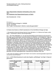 Senatsverwaltung für Justiz, Verbraucherschutz und Antidiskriminierung Herrn Abgeordneten Sebastian Schlüsselburg (Die Linke) über den Präsidenten des Abgeordnetenhauses von Berlin über Senatskanzlei - G Sen - Antwort auf die Schriftliche Anfrage Nr. 18/20035 vom 21. Juni 2019 über Projekt „Familienarbeit in Berliner Justizvollzugsanstalten“ _____________________________________________________________________ Im Namen des Senats von Berlin beantworte ich Ihre Schriftliche Anfrage wie folgt: 1. Wie bewertet der Senat die bisherige Arbeit der Freien Hilfe Berlin e.V. im Rahmen des Projekts „aufGe- fangen“ - Familienarbeit in Berliner Justizvollzugsanstalten? Zu 1.: Der Freie Hilfe Berlin e.V. ist nach der Einschätzung des Senats auf Grund der Er- fahrungen aus der bisherigen Zusammenarbeit ein erfahrener und kompetenter Träger der freien Straffälligenhilfe, der durch seine verschiedenen Beratungs- und Hilfsangebote für Gefangene seit mehreren Jahren kontinuierlich und verlässlich die Berliner Justizvollzugs- anstalten in der Beratung, Betreuung und insbesondere der Entlassungsvorbereitung der Gefangenen unterstützt. Das seit 2018 durch die Senatsverwaltung für Justiz, Verbrau- cherschutz und Antidiskriminierung im Rahmen der Zuwendungsfinanzierung geförderte Projekt „aufGefangen“ konnte in der Justizvollzugsanstalt (JVA) Moabit, der JVA Heidering und der JVA des Offenen Vollzuges Berlin etabliert werden. Das niederschwellige Bera- tungsangebot für inhaftierte Väter und deren Angehörige der Freie Hilfe Berlin e.V. wurde zu Beginn der Förderung mit den Justizvollzugsanstalten abgestimmt und stellt einen wichtigen Bestandteil der Maßnahmen zur Verbesserung des Kindeswohl, der Angehöri- genarbeit und einer bedarfsgerechten Unterstützung inhaftierter Eltern dar. 2. Wie wurden die Angebote im Rahmen des Projekts in den einzelnen Justizvollzugsanstalten angenommen und wie hoch sind die Fallzahlen? Zu 2.: In 2018 (Berichtszeitraum) wurde das Angebot „aufGefangen“ wie folgt in Anspruch genommen: Justizvollzugsanstalt Teilnehmende Anzahl der Beratungsge- (JVA) inhaftierte Väter spräche JVA Moabit 67 323 JVA Heidering 61 271 JVA offener Vollzug 45 87 Berlin Gesamt 173 681