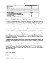 2 Teilnehmende Angehörige Kindesmütter 69 Kinder 118 Sonstige Angehörige 8 Haftentlassene Väter 5 Beratungsform Anzahl Familienkonferenzen/Elternberatung 35 Gruppensitzungen für inhaftierte Väter 23 Freizeitangebote 8 offene Beratung (Brunnenstraße) 242 3. Welches Feedback zum Projekt gab es vonseiten der Verantwortlichen in den einzelnen Justizvollzugsan- stalten oder auch von bisherigen Nutzerinnen und Nutzern der Angebote? Zu 3.: Die Angebote des Projektes „aufGefangen“ werden von den Mitarbeitenden der drei Justizvollzugsanstalten als sehr positiv und aussichtsreich für die Wiedereingliederung der Gefangenen und als angemessene und zielführende Unterstützung der Angehörigen be- wertet. Eine Einschätzung über die Bewertung der Angebote durch die Teilnehmenden kann aktuell nicht vorgenommen werden, da diese bisher nicht erhoben wurde. 4. Gab es in einzelnen Justizvollzugsanstalten Probleme bezüglich der Umsetzung des Projekts und wenn ja, welche? Wie konnte ggf. Abhilfe geschaffen werden? Zu 4.: In der JVA Heidering konnte bisher das Teilangebot der Vater-Kind-Gruppe nicht umgesetzt werden. Gründe hierfür liegen darin, dass die für die Umsetzung notwendige Personalpräsenz aktuell nicht zur Verfügung gestellt werden kann. Sobald sich diese Situ- ation verändert, ist eine Vater-Kind-Gruppe auch in der JVA Heidering umsetzbar. Die Se- natsverwaltung für Justiz, Verbraucherschutz und Antidiskriminierung bildet zurzeit 309 Anwärterinnen und Anwärter (Stichtag: 3. Juni 2019) aus, um die bestehende personelle Unterdeckung zu schließen. 5. Inwieweit wäre nach Einschätzung des Senats eine Ausweitung des Angebots unter dem Aspekt der Re- sozialisierung angeraten bzw. was spricht nach Einschätzung des Senats für oder gegen eine Ausweitung des Angebots? 6. Was wäre ggf. für eine Ausweitung des Angebots, insbesondere für die JVA Tegel, notwendig? Zu 5. und 6.: Der Senat kann diese Bewertung erst nach Feststellung des tatsächlichen Bedarfs in den anderen Justizvollzugsanstalten vornehmen. Für eine eventuelle Auswei- tung wäre eine Aufstockung der bisherigen Fördersumme im Rahmen der Zuwendungsfi- nanzierung notwendig. Berlin, den 5. Juli 2019 In Vertretung M. Gerlach Senatsverwaltung für Justiz, Verbraucherschutz und Antidiskriminierung