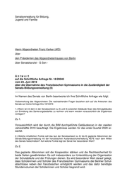Drucksache 18 / 20 045 Schriftliche Anfrage 18. Wahlperiode Schriftliche Anfrage des Abgeordneten Franz Kerker (AfD) vom 24. Juni 2019 (Eingang beim Abgeordnetenhaus am 26. Juni 2019) zum Thema: Übernahme des Französischen Gymnasiums in die Zuständigkeit der Senats- Bildungsverwaltung (II) und Antwort vom 05. Juli 2019 (Eingang beim Abgeordnetenhaus am 10. Juli 2019) Die Drucksachen des Abgeordnetenhauses sind bei der Kulturbuch-Verlag GmbH zu beziehen. Hausanschrift: Sprosserweg 3, 12351 Berlin-Buckow · Postanschrift: Postfach 47 04 49, 12313 Berlin, Telefon: 6 61 84 84; Telefax: 6 61 78 28.