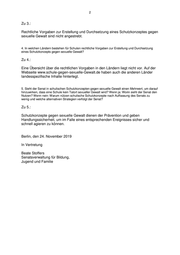2 Zu 3.: Rechtliche Vorgaben zur Erstellung und Durchsetzung eines Schutzkonzeptes gegen sexuelle Gewalt sind nicht angestrebt. 4. In welchen Ländern bestehen für Schulen rechtliche Vorgaben zur Erstellung und Durchsetzung eines Schutzkonzepts gegen sexuelle Gewalt? Zu 4.: Eine Übersicht über die rechtlichen Vorgaben in den Ländern liegt nicht vor. Auf der Webseite www.schule-gegen-sexuelle-Gewalt.de haben auch die anderen Länder landesspezifische Inhalte hinterlegt. 5. Sieht der Senat in schulischen Schutzkonzepten gegen sexuelle Gewalt einen Mehrwert, um darauf hinzuwirken, dass eine Schule kein Tatort sexueller Gewalt wird? Wenn ja: Worin sieht der Senat den Nutzen? Wenn nein: Warum nützen schulische Schutzkonzepte nach Auffassung des Senats zu wenig und welche alternativen Strategien verfolgt der Senat? Zu 5.: Schutzkonzepte gegen sexuelle Gewalt dienen der Prävention und geben Handlungssicherheit, um im Falle eines entsprechenden Ereignisses sicher und schnell agieren zu können. Berlin, den 24. November 2019 In Vertretung Beate Stoffers Senatsverwaltung für Bildung, Jugend und Familie