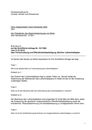 Drucksache 18 / 17 600 Schriftliche Anfrage 18. Wahlperiode Schriftliche Anfrage des Abgeordneten Frank Scholtysek (AfD) vom 21. Januar 2019 (Eingang beim Abgeordnetenhaus am 23. Januar 2019) zum Thema: Fortschreibung und Öffentlichkeitsbeteiligung, Berliner Luftreinhalteplan und Antwort vom 07. Februar 2019 (Eingang beim Abgeordnetenhaus am 12. Feb. 2019) Die Drucksachen des Abgeordnetenhauses sind bei der Kulturbuch-Verlag GmbH zu beziehen. Hausanschrift: Sprosserweg 3, 12351 Berlin-Buckow · Postanschrift: Postfach 47 04 49, 12313 Berlin, Telefon: 6 61 84 84; Telefax: 6 61 78 28.
