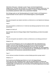öffentlichen Diskussion. Außerdem wurden Fragen mit Antwortmöglichkeiten aufgenommen, mit denen die Information zur Luftreinhaltung verbessert werden kann. Um die Repräsentativität der Umfrage besser einschätzen zu können, erfolgte die Abfrage anonymisierter persönlicher Daten und zur persönlichen Mobilität. Die Umfrage wurde von der Senatsverwaltung für Umwelt, Verkehr und Klimaschutz in Zusammenarbeit mit einer externen Kommunikationsagentur zusammengestellt. Frage 8: Wie wurde sichergestellt, dass möglichst viele Berliner und Berlinerinnen von der Möglichkeit der Beteiligung erfahren? Frage 9: Wie wurden die Berliner und Berlinerinnen im Vorfeld über diese Beteiligungsmöglichkeit informiert und/oder benachrichtigt? Antwort zu 8 und zu 9: Die Information über die Umfrage erfolgte mittels Pressemitteilung und über die sozialen Medien. Frage 10: Wie wurde sichergestellt, dass tatsächlich nur Berliner und Berlinerinnen an der Befragung teilnehmen? Antwort zu 10: Da es sich bei der Befragung nicht um eine politische Wahl oder Volksabstimmung handelt, muss eine solche Umfrage nicht auf Berlinerinnen und Berliner beschränkt werden. Auch die formale Öffentlichkeitsbeteiligung nach § 47 Abs. 5a Bundes- Immissionsschutzgesetz kennt keine Beschränkungen auf Beteiligte des Geltungsgebiets eines Luftreinhalteplans. Denn von den Maßnahmen des Luftreinhalteplans für Berlin sind auch Menschen und Unternehmen außerhalb Berlins betroffen. Frage 11: Können überhaupt verwertbare Informationen aus diesem Beteiligungsverfahren gezogen werden? Antwort zu 11: Die Auswertung des Beteiligungsverfahrens ist noch nicht abgeschlossen. Schon jetzt kann aber festgestellt werden, dass die schnellstmögliche Einhaltung der Luftqualitätsgrenzwerte mehrheitlich als wichtige Aufgabe angesehen wird und von vielen Teilnehmenden auch Maßnahmen wie Fahrverbote und Geschwindigkeitsbeschränkungen unterstützt werden. 3
