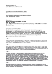 Drucksache 18 / 19 980 Schriftliche Anfrage 18. Wahlperiode Schriftliche Anfrage des Abgeordneten Bernd Schlömer (FDP) vom 19. Juni 2019 (Eingang beim Abgeordnetenhaus am 20. Juni 2019) zum Thema: Maßnahmen zur Verbesserung des Handyempfangs im Nord-Süd-Tunnel der Berliner S-Bahn und Antwort vom 05. Juli 2019 (Eingang beim Abgeordnetenhaus am 09. Jul. 2019) Die Drucksachen des Abgeordnetenhauses sind bei der Kulturbuch-Verlag GmbH zu beziehen. Hausanschrift: Sprosserweg 3, 12351 Berlin-Buckow · Postanschrift: Postfach 47 04 49, 12313 Berlin, Telefon: 6 61 84 84; Telefax: 6 61 78 28.