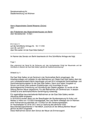 Drucksache 18 / 11 918 Schriftliche Anfrage 18. Wahlperiode Schriftliche Anfrage des Abgeordneten Daniel Wesener (GRÜNE) vom 26. Juli 2017 (Eingang beim Abgeordnetenhaus am 27. Juli 2017) zum Thema: Wie weiter mit der East Side Gallery? und Antwort vom 11. August 2017 (Eingang beim Abgeordnetenhaus am 15. August 2017) Die Drucksachen des Abgeordnetenhauses sind bei der Kulturbuch-Verlag GmbH zu beziehen. Hausanschrift: Sprosserweg 3, 12351 Berlin-Buckow · Postanschrift: Postfach 47 04 49, 12313 Berlin, Telefon: 6 61 84 84; Telefax: 6 61 78 28.