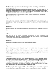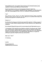 Abstandsflächenrechts, die angebliche Beeinträchtigung des Gebietscharakters sowie angebliche Verletzung des Gebots der Rücksichtnahme. Sowohl das beklagte Land als auch die beigeladene Bauherrin haben ihre Stellungnahmen zu den jeweiligen Klagebegründungen abgegeben. Es bleibt abzuwarten, wann das Verwaltungsgericht einen Termin zur mündlichen Verhandlung anberaumt. Frage 7: Was unternimmt der Senat, damit der vom Bezirk Friedrichshain-Kreuzberg geplante durchgängige, öffentliche Uferweg entlang der Spree ggf. trotz einer Bebauung des Grundstücks Mühlenstraße 61-63 planungsrechtlich abgesichert und realisiert werden kann? Antwort zu 7: Die öffentliche Durchwegung ist bereits planungsrechtlich gesichert. Im Bebauungsplan V- 74 ist ein 4 m breiter Streifen entlang der Spree mit einem Gehrecht für die Allgemeinheit festgesetzt. Die verlängerte Baugenehmigung sieht eine dementsprechende Nebenbestimmung vor: „Vor Baubeginn ist der Abschluss einer öffentlich-rechtlichen Vereinbarung oder Vorlage einer entsprechenden Verpflichtungserklärung für den Bau des geplanten Gehwegs am Spreeufer und dessen öffentliche Nutzung (dingliche Sicherung) und für einen öffentlichen Zugang auf dem Baugrundstück von der Mühlenstraße (Mauerlücke) zum geplanten Gehweg am Spreeufer (dingliche Sicherung) nachzuweisen.“ Berlin, den 11.08.17 In Vertretung Lüscher ................................ Senatsverwaltung für Stadtentwicklung und Wohnen 4