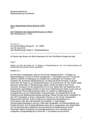 Senatsverwaltung für Stadtentwicklung und Wohnen Herrn Abgeordneten Dennis Buchner (SPD) über den Präsidenten des Abgeordnetenhauses von Berlin über Senatskanzlei - G Sen - Antwort auf die Schriftliche Anfrage Nr. 18 / 18526 vom 09. April 2019 über Blankenburger Süden II - Bürgerbeteiligung Im Namen des Senats von Berlin beantworte ich Ihre Schriftliche Anfrage wie folgt: Frage 1: Werden aus Sicht des Senats die „12 Regeln zur Bürgerbeteiligung“, die in der Senatsverwaltung für Stadtentwicklung entwickelt wurden, eingehalten? Antwort zu 1: Es wird davon ausgegangen, dass es sich bei den angesprochenen „12 Regeln zur Bürgerbeteiligung“ um die im Entwurf vorliegenden 11 Grundsätze aus dem Prozess der „Berliner Leitlinien für Beteiligung von Bürgerinnen und Bürgern an Prozessen und Projekten der räumlichen Stadtentwicklung“ mit Stand 26.09.2018 handelt. In diesem Sinne kann die Frage mit „ja“ beantwortet werden. So zeichnet sich z.B. das Projekt „Stadt behutsam weiterbauen im Blankenburger Süden“ bereits seit Beginn durch einen intensiven Austausch mit der Bürgerschaft vor Ort aus. Neben dem seit September 2016 bestehenden regelmäßigen Kontakt mit dem Forum Blankenburger Süden wurde auch auf Anregung des Forums Blankenburger Süden hin, parallel zur Beauftragung des Auftragnehmers für die Vorbereitenden Untersuchungen, ein Auftragnehmer für die Erstellung eines Beteiligungskonzeptes beauftragt. Dieses Konzept wurde maßgeblich im Jahr 2017 partizipativ in einem umfassenden Prozess vor Ort mit der interessierten Bürgerschaft entwickelt. Zudem erfolgt eine umfangreiche Bereitstellung von Informationen über den Internetauftritt des Projektes. In regelmäßigen Rundschreiben/Newslettern wird per E-Mail über Neuigkeiten und Zwischenstände zum Projekt informiert. Eine Projektmailadresse sowie die im vergangenen Jahr eingerichtete Vor-Ort-Sprechstunde ermöglichen eine barrierearme Kontaktaufnahme mit den Planenden seitens Verwaltung und Auftragsnehmenden. Auch zukünftig ist es vorgesehen, Bürgerbeteiligung im Sinne der 11 Grundsätze durchzuführen. 1