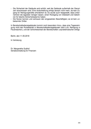 - Die Sicherheit der Gebäude wird erhöht, weil die Gebäude außerhalb der Dienst- zeit verschlossen sind. Eine Aufschließung erfolgt danach nicht mehr, da kein Zu- gang für Reinigungskräfte erforderlich ist. Es wurde auch festgestellt, dass Unter- nehmen die tagsüber reinigen lassen, einen Rückgang von Diebstahl und Gebüh- ren für falsche Sicherheitsalarme haben. - Die Nutzer kennen und vertrauen den eingesetzten Beschäftigten; es ist kein un- bekannter Dritter. In Bereitschaftsdienstgebäuden kommt noch besonders hinzu, dass eine Tagesreini- gung nicht den Ruhebetrieb in Bereitschaftsdienstgebäuden stört (z.B. Reinigung in Feuerwachen), und der Schichtwechsel der Bereitschaften unproblematischer erfolgt. Berlin, den 11.05.2018 In Vertretung Dr. Margaretha Sudhof Senatsverwaltung für Finanzen 6/6