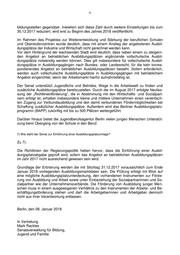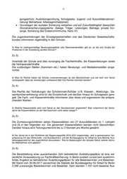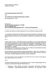 Senatsverwaltung für Bildung, Jugend und Familie Frau Abgeordnete Bettina König (SPD) über den Präsidenten des Abgeordnetenhauses von Berlin über Senatskanzlei - G Sen - Antwort auf die Schriftliche Anfrage Nr. 18/12991 vom 14. Dezember 2017 über Der DGB-Ausbildungsreports 2017 – Fazit und Konsequenzen ___________________________________________________________________ Im Namen des Senats von Berlin beantworte ich Ihre Schriftliche Anfrage wie folgt: 1) Im diesjährigen Ausbildungsreport des DGB stand die Qualität der Berufsschulen im Mittelpunkt. Wie be- urteilt der Senat das Resultat, dass nur 58% der befragten Auszubildenden die fachliche Qualität des Be- rufsschulunterrichts als „sehr gut“ oder „gut“ einschätzen, 14% jedoch nur als „ausreichend“ bzw. „mangel- haft“? Zu 1): In Berlin haben sich 931, in Brandenburg 833 Auszubildende an der Umfrage beteiligt. Bei über 48.000 Auszubildenden im Land unterblieb eine belastbare Aussage über die statisti- sche Repräsentativität der Umfrage. Es haben sich insgesamt 7 % der Befragten zum Ur- teil „mangelhaft“ für die Berufsschule entschieden; eine Differenzierung nach den beiden Bundesländern unterblieb. Offen bleibt auch der Zeitpunkt der Umfrage; über ein Drittel der Auszubildenden brechen ihre Ausbildung aus unterschiedlichen Gründen ab. Die Einschätzung eines dringenden Veränderungsbedarfes in Berlin wird nicht geteilt. Im Rahmen der Schulinspektion der beruflichen Schulen wurden darüber hinaus keine gene- rell erhöhten Veränderungsbedarfe beruflicher Schulen festgestellt. 2) In welchem Rahmen werden Auszubildende auf den Berufsschulen über ihre Rechte (Arbeitszeitgesetz, BBiG, Jugendarbeitsschutz usw.) informiert? Zu 2): Der Rahmenlehrplan Wirtschaft- und Sozialkunde sieht im ersten Ausbildungsjahr der Be- rufsschule in allen Berufen folgende Pflichtmodule vor: Interessen in Beruf, Betrieb und Schule verantwortlich wahrnehmen (Berufsbil- dungsgesetz, Jugendarbeitsschutzgesetz, allgemeiner und besonderer Kündi-