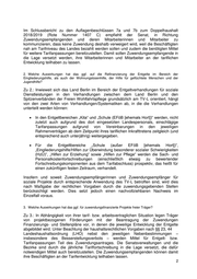 Im Schlussbericht zu den Auflagenbeschlüssen 7a und 7b zum Doppelhaushalt 2018/2019 (Rote Nummer 1407 C) empfiehlt der Senat, in Richtung Zuwendungsempfangenden und deren Mitarbeiterinnen und Mitarbeiter zu kommunizieren, dass keine Zuwendung deshalb verweigert wird, weil die Beschäftigten nah am Tarifniveau des Landes bezahlt werden sollen und zudem die benötigten Mittel für weitere Tarifanpassungen bereitzustellen. Damit sollen Zuwendungsempfangende in die Lage versetzt werden, ihre Mitarbeiterinnen und Mitarbeiter an der tariflichen Entwicklung teilhaben zu lassen. 2. Welche Auswirkungen hat das ggf. auf die Refinanzierung der Entgelte im Bereich der Eingliederungshilfe, als auch der Wohnungslosenhilfe, der Hilfe für geflüchtete Menschen und der Jugendhilfe? Zu 2.: Inwieweit sich das Land Berlin im Bereich der Entgeltverhandlungen für soziale Dienstleistungen in den Verhandlungen zwischen dem Land Berlin und den Spitzenverbänden der Freien Wohlfahrtspflege grundsätzlich am TV-L orientiert, hängt von den zwei Arten von Verhandlungen/Systematiken ab, in die die Verhandlungen unterteilt werden können: In den Entgeltbereichen „Kita“ und „Schule (EFöB [ehemals Hort])“ werden, nicht zuletzt auch aufgrund des dort eingesetzten Landespersonals, einschlägige Tarifanpassungen aufgrund von Vereinbarungen in den jeweiligen Rahmenverträgen ab dem Zeitpunkt ihres tariflichen Inkrafttretens zeitgleich (und entsprechend auch unterjährig) weitergegeben. Für die Entgeltbereiche „Schule (außer EFöB [ehemals Hort])“, „Eingliederungshilfe/Hilfen zur Überwindung besonderer sozialer Schwierigkeiten (HzÜ)“, „Hilfen zur Erziehung“ sowie „Hilfen zur Pflege“ werden die Sach- und Personalkostenfortschreibungen (einschließlich etwaig zu bewertender Fortschreibungskomponenten aus dem Tarifabschluss) prospektiv, das heißt für einen zukünftigen festen Zeitraum, verhandelt. Insofern und soweit Zuwendungsempfängerinnen und Zuwendungsempfänger für soziale Projekte durch entsprechende Anwendung des TV-L betroffen sind, wird dies nach Maßgabe der rechtlichen Vorgaben durch die zuwendungsgebenden Stellen berücksichtigt werden. Dies setzt jedoch einen nachvollziehbaren Nachweis im Einzelfall voraus. 3. Welche Auswirkungen hat das ggf. für zuwendungsfinanzierte Projekte freier Träger? Zu 3.: In Abhängigkeit von ihrer tarif- bzw. arbeitsvertraglichen Situation legen Träger von projektbezogenen Förderungen mit der Beantragung der Zuwendungen Finanzierungs- und Stellenpläne vor, in denen die jeweilige Entwicklung der Entgelte abgebildet wird. Unter Beachtung der haushaltsrechtlichen Vorgaben nach §§ 23, 44 Landeshaushaltsordnung (LHO) nebst den jeweiligen Nebenbestimmungen – insbesondere des Besserstellungsverbots – werden Mittel für Entgelt- bzw. Tarifanpassungen Teil des Zuwendungsantrages. Die Senatsverwaltungen und die Bezirke sind durch die jährliche Tariffortschreibung in die Lage versetzt, die dafür notwendigen Mittel auch bereitzustellen. Die Zuwendungsempfangenden können damit ihre Beschäftigten an der Tarifentwicklung teilhaben lassen. 2