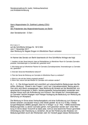 Senatsverwaltung für Justiz, Verbraucherschutz und Antidiskriminierung Herrn Abgeordneten Dr. Gottfried Ludewig (CDU) über den Präsidenten des Abgeordnetenhauses von Berlin über Senatskanzlei - G Sen - Antwort auf die Schriftliche Anfrage Nr. 18/12 654 vom 7. November 2017 über Werbung für illegale Drogen im öffentlichen Raum verbieten Im Namen des Senats von Berlin beantworte ich Ihre Schriftliche Anfrage wie folgt: 1. Inwiefern ist dem Senat bekannt, dass auf Werbeflächen im öffentlichen Raum für Cannabis (Cannabis- produkte, Veranstaltungen zu Cannabis etc.) geworben wird? 2. Wie häufig wird auf öffentlichen Flächen für Cannabis (Cannabisprodukte, Veranstaltungen zu Cannabis etc.) geworben? 3. Sind dem Senat die Werbeflächen bekannt? 4. Plant der Senat die Werbung von Cannabis im öffentlichen Raum zu verbieten? a. Wenn ja, wie soll das Verbot umgesetzt werden? b. Wenn nein, warum soll das Werben für Cannabis nicht verboten werden? Zu 1. - 4.: Die Anfrage bezieht sich ersichtlich auf unterschiedliche Bedeutungen des Be- griffes „Werbung“. Soweit in den Fragen 1 und 2 auf „Cannabisprodukte“ Bezug genom- men wird, wird davon ausgegangen, dass Werbung als Hinweis auf die Bereitschaft, ent- sprechende Erzeugnisse zu liefern, beziehungsweise Verkaufsangebot verstanden wird, darüber hinaus auch als Aufforderung zum Konsum. Der Hinweis auf „Veranstaltungen zu Cannabis“ berührt hingegen nach hiesiger Auslegung die Bedeutung von Werbung als Bemühung um Akzeptanz. Die Werbung im Sinne eines Verkaufsangebots und einer Aufforderung zum Konsum ist bereits verboten und darüber hinaus unter Strafe gestellt. So ist in § 14 Abs. 5 Betäu- bungsmittelgesetz (BtMG) geregelt, dass für in Anlage I zu § 1 Abs. 1 BtMG bezeichnete Betäubungsmittel, zu denen Cannabis gehört, nicht geworben werden darf. Unter Wer- bung im Sinne dieser Vorschrift ist dabei jede, nicht an eine bestimmte Person gerichtete Ankündigung oder Anpreisung zu verstehen, die auf die Förderung des Absatzes von Betäubungsmitteln durch den Werbenden zielt. Ein Verstoß gegen dieses Werbeverbot