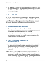 Richtlinie zur Korruptionsprävention 7.2 Bei Tätigkeiten in besonders korruptionsgefährdeten Arbeitsgebieten – auch bei einem Wechsel dorthin – sollen in regelmäßigen Abständen eine erneute Sensibilisierung und eine vertiefte arbeitsplatzbezogene Belehrung der Beschäftigten erfolgen. 8 Aus- und Fortbildung Die Aus- und Fortbildungseinrichtungen nehmen das Thema „Korruptionsprä- vention“ in ihre Programme auf. Hierbei ist vor allem der Fortbildungsbedarf der Führungskräfte, der Ansprechpersonen für Korruptionsprävention, der Beschäf- tigten in besonders korruptionsgefährdeten Arbeitsgebieten und der Beschäftig- ten der in Nr. 6 genannten Organisationseinheiten zu berücksichtigen. 9 Konsequente Dienst- und Fachaufsicht 9.1 Die Vorgesetzten üben ihre Dienst- und Fachaufsicht konsequent aus („Leit- faden für Vorgesetzte und Behördenleitungen“; Anlage 2). Dies umfasst eine aktive vorausschauende Personalführung und -kontrolle. 9.2 In diesem Zusammenhang achten die Vorgesetzten auf Korruptionssignale. Sie sensibilisieren regelmäßig und bedarfsorientiert ihre Mitarbeiterinnen und Mitarbeiter für Korruptionsgefahren. 10 Unterrichtungen und Maßnahmen bei Korruptionsverdacht 10.1 Bei einem durch Tatsachen begründeten Verdacht einer Korruptionsstraftat hat die Dienststellenleitung unverzüglich die Staatsanwaltschaft und die oberste Dienstbehörde zu unterrichten; außerdem sind behördeninterne Ermittlungen und vorbeugende Maßnahmen gegen eine Verschleierung einzuleiten. 10.2 Die obersten Bundesbehörden teilen jährlich dem Bundesministerium des Innern – auch für den jeweils nachgeordneten Bereich – in vorgegebener anonymisierter Form die Verdachtsfälle mit, in denen Verfahren eingeleitet wurden (untergliedert nach Bereich, Sachverhalt, eingeleiteten Maßnahmen), sowie den Ausgang der Verfahren, die im Berichtsjahr abgeschlossen wurden. 10