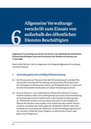 6 Verwaltungs- Allgemeine Verwaltungs vorschrift zum Einsatz von außerhalb des öffentlichen Dienstes Beschäftigten Allgemeine Verwaltungsvorschrift zum Einsatz von außerhalb des öffentlichen Dienstes Beschäftigten (externen Personen) in der Bundesverwaltung vom 17. Juli 2008 Nach Artikel 86 Satz 1 des Grundgesetzes wird folgende allgemeine Verwaltungs- vorschrift erlassen: 1 Anwendungsbereich und Begriffsbestimmung 1.1 Der Einsatz externer Personen dient dem Personalaustausch und dem Wis- senstransfer zwischen der Verwaltung und der privaten Wirtschaft sowie Einrichtungen aus Wissenschaft, Kultur und Zivilgesellschaft. Er richtet sich bei allen Dienststellen des Bundes nach dieser Verwaltungsvorschrift. 1.2 Externe Person ist, wer außerhalb des öffentlichen Dienstes in einem Arbeitsverhältnis steht und vorübergehend und unter Aufrechterhaltung seines bisherigen Arbeitsverhältnisses in der Bundesverwaltung tätig ist. Öffentlicher Dienst im Sinne dieser Vorschrift ist die Tätigkeit im Dienste des Bundes, eines Landes, einer Gemeinde oder anderer Körper- schaften, Anstalten oder Stiftungen des öffentlichen Rechts oder ihrer Verbände mit Ausnahme der öffentlich-rechtlichen Religionsgesellschaf- ten und ihrer Verbände. Einer Tätigkeit im öffentlichen Dienst steht gleich eine Tätigkeit für 68