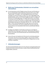 Allgemeine Verwaltungsvorschrift zum Einsatz von außerhalb des öffentlichen Dienstes Beschäftigten 6 Belehrung; Verhaltenskodex; Sicherheit von vertraulichen Informationen 6.1 Für die Entsendung und die Tätigkeit externer Personen sind Vereinbarun- gen zum Übergang des arbeitsrechtlichen Direktionsrechts und zur Wah- rung des Daten-, Fernmelde- und Geschäftsgeheimnisses sowie Verhal- tensregeln für externe Personen zu treffen. Der in der Anlage abgedruckte Verhaltenskodex und der „Verhaltenskodex gegen Korruption“ (Anlage 1 der Richtlinie der Bundesregierung zur Korruptionsprävention in der Bundes- verwaltung vom 30. Juli 2004, BAnz. S. 17745) sowie ein Abdruck des Rund- schreibens zum Verbot der Annahme von Belohnungen und Geschenken in der Bundesverwaltung vom 8. November 2004 (Az.: D I 3 – 210 170/1, GMBl. 2004, S. 1074) in den jeweils geltenden Fassungen sind von der externen Person zu unterzeichnen. Sie sind als Anlagen dem Vertrag zwischen der externen Person, der entsendenden Stelle und der aufnehmenden Behörde beizufügen. 6.2 Vor Beginn der Tätigkeit in der Bundesverwaltung ist in der Regel ein behördliches Führungszeugnis nach § 30 Abs. 5 des Bundeszentralregister- gesetzes einzuholen und erforderlichenfalls eine Sicherheitsüberprüfung durchzuführen. 6.3 Externe Personen sind spätestens bei Dienstantritt auf die Besonderheiten hinzuweisen, die sich aus ihrem Status ergeben, und nach dem Verpflich- tungsgesetz auf die gewissenhafte Erfüllung ihrer Obliegenheiten aus dem Auftrag zu verpflichten. 7 Schlussbestimmungen Die obersten Bundesbehörden können für ihren Bereich weitergehende Beschrän- kungen des Einsatzes externer Personen vorsehen. Bereits bestehende Beschrän- kungen bleiben unberührt. 72