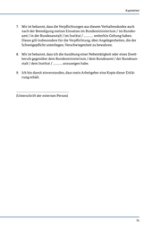 Kapiteltitel 7. Mir ist bekannt, dass die Verpflichtungen aus diesem Verhaltenskodex auch nach der Beendigung meines Einsatzes im Bundesministerium / im Bundes- amt / in der Bundesanstalt / im Institut / ………… weiterhin Geltung haben. Dieses gilt insbesondere für die Verpflichtung, über Angelegenheiten, die der Schweigepflicht unterliegen, Verschwiegenheit zu bewahren. 8. Mir ist bekannt, dass ich die Ausübung einer Nebentätigkeit oder eines Zweit- berufs gegenüber dem Bundesministerium / dem Bundesamt / der Bundesan- stalt / dem Institut / ………… anzuzeigen habe. 9. Ich bin damit einverstanden, dass mein Arbeitgeber eine Kopie dieser Erklä- rung erhält. ………………………………….......................…… (Unterschrift der externen Person) 75