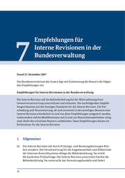 7 Empfehlungen Empfehlungenfür für Interne Revisionen in der Bundesverwaltung der Bundesverwaltung Stand 21. Dezember 2007 Das Bundesministerium des Innern legt mit Zustimmung der Ressorts die folgen- den Empfehlungen vor: Empfehlungen für Interne Revisionen in der Bundesverwaltung Die Interne Revision soll die Behördenleitung bei der Wahrnehmung ihrer Gesamtverantwortung unterstützen und entlasten. Die nachfolgenden Empfeh- lungen basieren auf den heutigen Standards für die Interne Revision. Die Ent- scheidung und Verantwortung, ob und inwieweit in den jeweiligen Ressorts eine Interne Revision erforderlich ist und wie diese Empfehlungen umgesetzt werden, insbesondere welche Modifikationen auf Grund von Ressortbesonderheiten nötig sind, bleibt den einzelnen Ressorts vorbehalten. Diese Empfehlungen dienen als Richtschnur für die Interne Revision. 1. Allgemeines (1) Die Interne Revision soll durch Prüfungs- und Beratungsleistungen Risi- ken mindern. Die Verantwortung für die Angemessenheit und Effektivität der Internen Kontrollsysteme obliegt der Behördenleitung. Sie erteilt die konkreten Prüfaufträge. Die Interne Revision unterstützt hierbei die Behördenleitung. Sie untersucht das Verwaltungshandeln und liefert 76