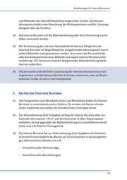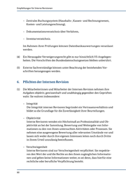 Empfehlungen für Interne Revisionen - Zentrales Buchungssystem (Haushalts-, Kassen- und Rechnungswesen, Kosten- und Leistungsrechnung), - Dokumentationsverzeichnis über Verfahren, - Inventarverzeichnis. Im Rahmen ihrer Prüfungen können Datenbankauswertungen veranlasst werden. (4) Ein Herausgabe-Verweigerungsrecht gibt es nur hinsichtlich VS-Angelegen- heiten. Die Vorschriften des Bundesdatenschutzgesetzes bleiben unberührt. (5) Externe Sachverständige können unter Beachtung der bestehenden Vor- schriften herangezogen werden. 6. Pflichten der Internen Revision (1) Die Mitarbeiterinnen und Mitarbeiter der Internen Revision nehmen ihre Aufgaben objektiv, gewissenhaft und unabhängig gegenüber den Geprüften wahr. Sie wahren insbesondere: - Integrität Die Integrität interner Revisoren begründet ein Vertrauensverhältnis und bildet so die Grundlage für die Zuverlässigkeit ihrer Beurteilungen. - Objektivität Interne Revisoren wenden ein Höchstmaß an Professionalität und Ob- jektivität an bei der Sammlung, Bewertung und Weitergabe von Infor- mationen zu den von ihnen untersuchten Aktivitäten oder Prozessen. Sie nehmen eine ausgewogene Bewertung aller relevanten Umstände vor und lassen sich weder durch ihre eigenen Interessen leiten noch durch Dritte in ihrem Urteil unzulässig beeinflussen. - Verschwiegenheit Interne Revisoren sind zur Verschwiegenheit verpflichtet. Sie respektie- ren den Wert der und die Rechte an den ihnen zugänglichen Informatio- nen und geben keine Informationen weiter, es sei denn, dass hierfür eine rechtliche oder berufliche Verpflichtung besteht. 80