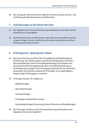 Empfehlungen für Interne Revisionen (2) Die Leitung der Internen Revision trägt die Verantwortung für die Aus- und Fortbildung der Mitarbeiterinnen und Mitarbeiter. 7. Anforderungen an die Interne Revision (1) Die Tätigkeit in der Internen Revision ist grundsätzlich unvereinbar mit der Ausübung von Fachaufgaben. (2) Die Mitarbeiterinnen und Mitarbeiter sollen über hinreichende Berufserfah- rungen verfügen. Sie sind verpflichtet, sich stetig weiterzubilden und ihren Wissensstand aktuell zu halten. 8. Prüfungsarten, -planung und -ablauf (1) Die Interne Revision erstellt auf der Grundlage der behördenbezogenen Gefährdungs- bzw. Risikoanalyse unter Berücksichtigung des Aufwand-/ Nutzenverhältnisses einen Prüfungsthemenkatalog und erarbeitet eine darauf basierende Prüfungsplanung. Diese ist der Behördenleitung zur Genehmigung vorzulegen. Die Prüfungsplanung beinhaltet die sachlichen, personellen und zeitlichen Aspekte der Prüfungen. Es ist regelmäßig ein längerfristiger Prüfungsplan zu erstellen. (2) Prüfungen können z. B. erfolgen als: - Regelprüfungen, - Bestandsprüfungen, - Systemprüfungen, - Prüfungen aus besonderem Anlass, - Nachschauprüfungen (Umsetzung früherer Hinweise und Empfehlungen). (3) Die Prüfungen werden je nach Schwerpunktsetzung insbesondere nach folgenden Kriterien durchgeführt: 81