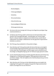Empfehlungen für Interne Revisionen - Rechtmäßigkeit, - Ordnungsmäßigkeit, - Sicherheit, - Wirtschaftlichkeit, - Zukunftssicherung, - Zweckmäßigkeit/Effektivität, - Wirkungsorientierung. (4) Die Interne Revision kündigt die Prüfung in der Regel den jeweiligen Orga- nisationseinheiten an. (5) Im Rahmen der Prüfung erhebt und bewertet sie die Sachverhalte, doku- mentiert die Prüfungshandlungen, -feststellungen und -bewertungen. Bereits in diesem Stadium sind gewonnene Erkenntnisse und die darauf aufbauenden Vorschläge zu Maßnahmen mit den geprüften Organisations- einheiten zu erörtern. (6) Die Prüfung soll grundsätzlich in Teamarbeit erfolgen. (7) Zum Abschluss der Prüfung übersendet die Interne Revision unverzüglich an die jeweilige Organisationseinheit einen Entwurf des Prüfungsberichts, in dem neben den Feststellungen und Wertungen soweit erforderlich auch Vorschläge zur Mängelbeseitigung oder für Verbesserungen gemacht werden. (8) In einer Abschlussbesprechung wird dem geprüften Bereich nach Erörterung Gelegenheit zur Stellungnahme gegeben. Stellungnahmen können auch schriftlich erfolgen. Über die Ergebnisse der Abschlussbesprechung wird ein Protokoll geführt. (9) Nach Abschluss der Prüfung wird der Behördenleitung unverzüglich der endgültige Prüfungsbericht vorgelegt. Die geprüfte Organisationseinheit erhält in der Regel hiervon eine Abschrift. 82