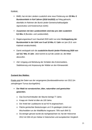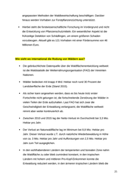 Konkret: BMEL hat mit den Ländern zusätzlich eine neue Förderung von 25 Mio. € Bundesmitteln in fünf Jahren (2018 bis2022) auf Weg gebracht, ebenfalls im Rahmen der Bund-Länder-Gemeinschaftsaufgabe Agrarstruktur und Küstenschutz (GAK). Zusammen mit den Landesmitteln sind das pro Jahr zusätzlich 8,3 Mio. € (Bundes- und Landesmittel). Regierungsentwurf zum Haushalt 2020 sieht nun eine Verdoppelung der Bundesmittel in der GAK von 5 auf 10 Mio. € / Jahr vor (am 25.6. vom Kabinett verabschiedet). Damit verdoppelt sich die zusätzliche Bund-Länder-Förderung 2020 von auf 16,7 Mio. €/ Jahr. Jetzt kommt es auf die Länder an, die Mittel abzurufen. Ziel: Umgang und Behebung der Schäden des Extremwetters, Stabilisierung und Anpassung der Wälder an den Klimawandel. Zustand des Waldes: Positiv sind die Daten aus der vergangenen Bundeswaldinventur von 2012 (im zehnjährigem Turnus durchgeführt): Der Wald ist vorratsreicher, älter, naturnäher und gemischter geworden. o Das Durchschnittsalter der Bäume beträgt 77 Jahre. o Knapp ein Viertel ist älter als 100 Jahre. o Der Anteil der Laubbäume ist auf 43 % angewachsen. o Fläche gemischter Bestockungen um 5 % gestiegen (Anteil von Mischwäldern an der Waldfläche insgesamt: 76% nach BWI 3) o Da weniger genutzt wurde als nachgewachsen ist, hat der Holzvorrat 2012 mit 336 m3 pro Hektar in historischen und europäischen Vergleich 21