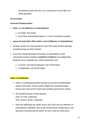 Höchstwerte erreicht. Bis 2017 ist er nochmal um 6 % auf 358 m³ je Hektar gestiegen. Das ist negativ: Konkrete Schadenszahlen: 2018: rund 32,4 Millionen m³ Kalamitätsholz o Ein Drittel: Sturmwürfe o Zwei Drittel: Borkenkäferschäden (z.T. durch Trockenheit verstärkt) Januar bis Ende März 2019: weitere rund 13 Millionen m³ Kalamitätsholz Schäden werden sich voraussichtlich im Jahr 2019 weiter erhöhen (ähnliche Schadholzmenge wir 2018 erwartet) Durch den schadensbedingten Einschlag von Kalamitätsholz sowie vertrocknete Kulturen entstehen erhebliche Freiflächen und aufgelichtete Bestände, die zu verjüngen bzw. wieder aufzuforsten sind: o im Privat- und Körperschaftswald: rund 76 000 Hektar o im Staatswald: rund 38 000 Hektar Daten zu Schädlingen Daten zu Schädlingskalamitäten bezogen auf einzelne Schädlingsarten werden nicht erfasst. Erfasst werden lediglich die Schadholzmengen. Daraus kann nicht auf die Ursache des Schadens geschlossen werden. Als Schadholzmengen werden genannt: 2018: 32,4 Mio. Kubikmeter 2019: vorauss. 35 Mio. Kubikmeter Nach den Meldungen der Länder sind im Jahr 2018 rund 32,4 Millionen m³ Kalamitätsholz angefallen. Dies ist das viertschwerste Schadereignis in der deutschen Forstwirtschaft der letzten 30 Jahre. Etwa ein Drittel davon 22