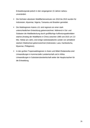 Entwaldungsrate jedoch in den vergangenen 15 Jahren nahezu unverändert. Die höchsten absoluten Waldflächenverluste von 2010 bis 2015 wurden für Indonesien, Myanmar, Nigeria, Tansania und Brasilien gemeldet. Die Waldregionen Asiens z.B. sind regional von einer stark unterschiedlichen Entwicklung gekennzeichnet. Während in Ost- und Südasien die Waldbedeckung durch großflächige Aufforstungsaktivitäten wächst (Anstieg der Waldfläche in China zwischen 1990 und 2015 um 2,0 Mio. Hektar pro Jahr), sind einige südostasiatische Länder von anhaltend starkem Waldverlust gekennzeichnet (Indonesien, Laos, Kambodscha, Myanmar, Philippinen). In den großen Tropenwaldregionen in Asien und Mittel-/Südamerika sind Umwandlungen in kommerzielle Landwirtschaft und in Afrika Umwandlungen in Subsistenzlandwirtschaft weiter die Hauptursachen für die Entwaldung. 26