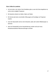 Kernbotschaften Klimaschutz Es geht um unsere Verantwortung dafür, unser Wirtschaften enkeltauglich zu machen. Deshalb ist der Klimaschutz, der Erhalt unserer Natur, der Artenvielfalt, ein Thema, das wir zu unserer Leitschnur machen müssen. Als erstes Ministerium habe ich unsere Klimaschutzmaßnahmen vorgelegt. Landwirtschaft verursacht unvermeidlich Emissionen für die Nahrungsmittelerzeugung. Sie ist aber auch Teil der zur Lösung, wenn sie durch Minderung von Treibhausgasen und Anpassungsmaßnahmen reagiert. Rolle der Landwirtschaft Kaum eine Branche leidet so existentiell unter dem Klimawandel wie die Landwirtschaft. Unsere Bauern spüren die extremen Auswirkungen bei der Ernte. Zu trockene oder zu nasse Jahrgänge bedeuten teils erhebliche Einbußen für die Betriebe. Richtig ist, dass Landwirtschaft Opfer, Beteiligter, aber eben auch Lösungsbringer beim Klimawandel ist. Sie hat allerhand Möglichkeiten zur Bindung von CO2 und zum Schutz unseres Klimas. Klar ist aber auch: Produktion von Lebensmittel wird nicht ganz ohne Emissionen gehen. Branche ist deutlich weiter als oft dargestellt, große Offenheit für Natur/Umwelt/Klimaschutz. Gerade weil die Landwirte wissen, dass es letztlich um Sicherung der eigenen Existenzgrundlage geht. 46