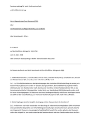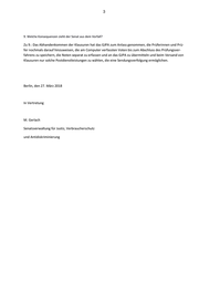 3 9. Welche Konsequenzen zieht der Senat aus dem Vorfall? Zu 9.: Das Abhandenkommen der Klausuren hat das GJPA zum Anlass genommen, die Prüferinnen und Prü- fer nochmals darauf hinzuweisen, die am Computer verfassten Voten bis zum Abschluss des Prüfungsver- fahrens zu speichern, die Noten separat zu erfassen und an das GJPA zu übermitteln und beim Versand von Klausuren nur solche Postdienstleistungen zu wählen, die eine Sendungsverfolgung ermöglichen. Berlin, den 27. März 2018 In Vertretung M. Gerlach Senatsverwaltung für Justiz, Verbraucherschutz und Antidiskriminierung