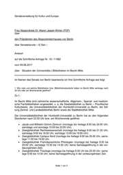 Senatsverwaltung für Kultur und Europa Frau Abgeordnete Dr. Maren Jasper-Winter (FDP) über den Präsidenten des Abgeordnetenhauses von Berlin über Senatskanzlei – G Sen – Antwort auf die Schriftliche Anfrage Nr. 18 / 11982 vom 09.08.2017 über Situation der (Universitäts-) Bibliotheken im Bezirk Mitte Im Namen des Senats von Berlin beantworte ich Ihre Schriftliche Anfrage wie folgt: 1. Wie viele und welche Bibliotheken bzw. Bibliotheksstandorte haben im Bezirk Mitte werktags nach 22 Uhr oder am Wochenende geöffnet? Zu 1.: Im Bezirk Mitte sind zahlreiche wissenschaftliche, Allgemein-, Spezial- und medizini- sche Fachbibliotheken angesiedelt, u. a. die Staatsbibliothek zu Berlin – Preußischer Kulturbesitz, die Universitätsbibliothek der Humboldt-Universität zu Berlin, die Stif- tung Zentral- und Landesbibliothek Berlin sowie die Stadtbibliothek Mitte. Die Universitätsbibliothek der Humboldt-Universität zu Berlin hat an den folgenden Standorten nach 22:00 Uhr bzw. am Wochenende geöffnet: Jacob-und-Wilhelm-Grimm-Zentrum (montags bis freitags 8:00 bis 24:00 Uhr, samstags und sonntags 10:00 bis 22:00 Uhr). Zweigbibliothek Rechtswissenschaft (montags bis freitags 9:00 bis 21:30 Uhr, samstags 9:00 bis 18:00 Uhr, sonntags 13:00 bis 18:00 Uhr). Zweigbibliothek Campus Nord (montags bis freitags 9:00 bis 20.00 Uhr, sams- tags 11:00 bis 19:00 Uhr. Zweigbibliothek Fremdsprachliche Philologien (montags bis freitags 9:30 bis 20:00 Uhr, samstags 10:30 bis 14:30 Uhr; keine Samstagsöffnung in der vor- lesungsfreien Zeit). Zweigbibliothek Theologie (montags bis freitags 9:30 Uhr bis 20:30 Uhr, sams- tags 9:30 bis 13:30 Uhr; keine Samstagsöffnung in der vorlesungsfreien Zeit. Seite 1 von 3