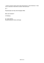 7. Welchen finanziellen Aufwand würden längere Öffnungszeiten für weitere Bibliotheken im Stadt- zentrum, insbesondere im Bezirk Mitte, verursachen? Bitte aufschlüsseln. Zu 7.: Pauschal lassen sich dazu keine Aussagen treffen. Berlin, den 23.08.2017 In Vertretung Dr. Torsten Wöhlert Senatsverwaltung für Kultur und Europa Seite 3 von 3