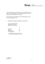 Insgesamt trifft die Kampagne auf überdurchschnittlich gute Resonanz: 60 Prozent derjenigen, die die Kampagne „Ich bin ein Berliner“ kennen, finden diese sehr gut (6 %) oder gut (54 %). 20 Prozent gefällt die Kampagne weniger gut (19 %) oder schlecht (1 %). Gesamtbewertung der Kampagne „Ich bin ein Berliner“ *) Die Kampagne „Ich bin ein Berliner“ gefällt % sehr gut 6 gut 54 weniger gut 19 schlecht **) 1 *) Basis: Befragte, die „Ich bin ein Berliner“ kennen **) an 100 Prozent fehlende Angaben = „weiß nicht“ 9