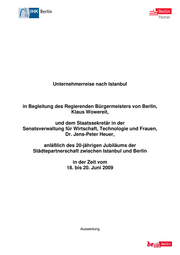 Unternehmerreise nach Istanbul in Begleitung des Regierenden Bürgermeisters von Berlin, Klaus Wowereit, und dem Staatssekretär in der Senatsverwaltung für Wirtschaft, Technologie und Frauen, Dr. Jens-Peter Heuer, anläßlich des 20-jährigen Jubiläums der Städtepartnerschaft zwischen Istanbul und Berlin in der Zeit vom 18. bis 20. Juni 2009 Auswertung
