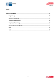 Inhalt: ERSTES FEEDBACK .................................................................................................................. 3 Fragestellung....................................................................................................................... 3 Feedback-Beteiligung.......................................................................................................... 4 Tabellarische Auswertung ................................................................................................... 4 Graphische Auswertung ...................................................................................................... 5 Kommentare und Anregungen ............................................................................................ 7 Fazit................................................................................................................................... 10 To do ................................................................................................................................. 10 -2-