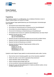 Erstes Feedback (Stand 7. Juli 2009, 13 Rückläufe) Fragestellung Alle Teilnehmer wurden 24. Juni 2009 gebeten, ihre unmittelbaren Eindrücke in einem 2- seitigen Feedback-Bogen zum Ausdruck zu bringen. Es wurde folgende Fragen gestellt (Bewertung nach Schulnotensystem; Kommentierungen waren möglich): • Wie bewerten Sie die Istanbul-Reise insgesamt? • Wie wichtig sind Unternehmerreisen als Unterstützung Ihrer Geschäftstätigkeit? • Wie wichtig ist die politische Begleitung einer solchen Reise? • Wie sinnvoll ist Verbindung von Standortwerbung und Absatzförderung? • Wie bewerten Sie die Chancen für zusätzliche Geschäftsabschlüsse nach dieser Reise? • Bewerten Sie bitte das Hotel „Conrad“: bzgl. Ihrer Unterbringung bzgl. der Wirtschaftskonferenz • Bewerten Sie bitte die organisatorische Betreuung durch die IHK und Berlin Partner. • Bewerten Sie bitte die organisatorische Betreuung durch die AHK Istanbul. • Bewerten Sie bitte die Einbeziehung von be Berlin. • Bewerten Sie bitte die folgenden Programmpunkte mit Blick auf Ihre Geschäftsinteressen: Bootstour am 18. Juni Konferenz am 19. Juni B2B-Meetings am 19. Juni Abendempfang am19. Juni Zusätzlich wurden folgende Fragen gestellt, die verbal beantwortet werden sollten / konnten: • Was hat Ihnen bei der Vorbereitung gefehlt, was ist Ihnen besonders aufgefallen? • Würden Sie wieder an einer ähnlich organisierten Reise teilnehmen? • Welche Aktivitäten sollten der Reise folgen? • Welche Verbesserungsvorschläge haben Sie? • Ist Ihnen das Berliner Außenwirtschaftsförderprogramm bekannt? • Wussten Sie, dass das Wirtschaftsprogramm in Istanbul aus Berliner Landes- und aus EU-Mitteln gefördert worden ist? -3-