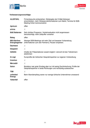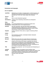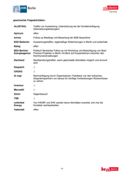 Kommentare und Anregungen das war aufgefallen: ALUSTAHL B2B-Meetings mit Anwälten, Immobileinmaklern und Messevertretern sind überflüssig; Zeitmanagement bei B2B-Meeting war sehr gut; RBm hätte gegenüber den Firmen mehr Präsenz zeigen sollen (Empfang) Apricum offen arinna alles zur vollen Zufriedenheit organisiert BAE Batterien zufrieden mit der Vorbereitung; kontinuierliche und umfangreiche Information Bateg offen BEA Berliner Zu kurzfristige B2B-Meetings für ausreichende Vorarbeit; keine Energieagentur Hintergrundinformation zu den Gesprächspartnern Dachland Sehr gute Organisation, sehr guter Berlin-Auftritt, ausgewogener Teilnehmerquerschnitt; U-Reisen sind um Trends früh zu erkennen; Kombination Absatzförderung/Standortwerbung sehr wichtig für eigene Netzwerkarbeit; be Berlin förderlich für Berlin-Image Despatch Profile der türkischen Partner wären zur eigenen Vorbereitung hilfreich gewesen GASAG ./. ib vogt Gute Vorbereitung der Reise,; hochwertige Kontakte; interessante Gesprächsmöglichkeiten Inventux ./. Mercedöl BP/IHK haben immer über den neuesten Stand der Vorbereitungen informiert; ausführliches Programmheft mit Hintergrundinformationen Solon be Berlin hat der Gruppe Profil verliehen; erstklassige AHK-Leistung; Termine jedoch oft umdisponiert; Liste für B2B.-Meetings kam zu spät für Recherche, dadurch teilweise chaotische Gespräche; zu wenig Aufmerksamkeit der beiden Bürgermeister für Firmen, Präsentationen bei der Konferenz mit sehr gutem Bezug zu den Firmen TSB Blockerstellung professionell - aber nicht essentiell (unter Einbeziehung von be Berlin) unlimited Vorträge zu Energie und Investitionen bei der Konferenz waren Energy hervorragend; politische Begleitung verleiht dem Auftritt mehr Gewicht; Hotel mit gehobenem Standard und gutem Service; be Berlin war interessant, jedoch wenig Auswirkung auf Geschäftsabschlüsse; B2B-Meeting top organisiert, daher viele Ansätze Vattenfall offen -7-