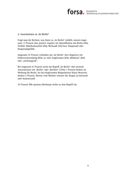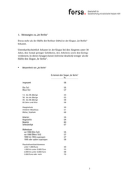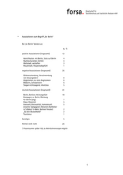 2. Assoziationen zu „be Berlin“ Fragt man die Berliner, was ihnen zu „be Berlin“ einfällt, nennen insge- samt 12 Prozent eher positive Aspekte wie Identifikation mit Berlin (4%), Vielfalt, Multikulturalität (4%), Weltstadt (3%) bzw. Hauptstadt oder Hauptstadtgefühl. Insgesamt 25 Prozent verbinden mit „be Berlin“ eher Negatives wie Geldverschwendung (8%), zu viele Anglizismen (6%) „Blödsinn“ (6%) oder „nichtssagend“. Bei insgesamt 41 Prozent weckt der Begriff „be Berlin“ eher neutrale Assoziationen wie „Berlin“ oder „Berliner“ (19%). 7 Prozent denken an Werbung für Berlin. An den Regierenden Bürgermeister Klaus Wowereit denken 5 Prozent. Ebenso viele Berliner erinnert der Slogan an bisexuell oder homosexuell. 25 Prozent fällt spontan überhaupt nichts zu dem Begriff ein. 4