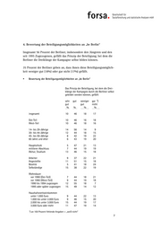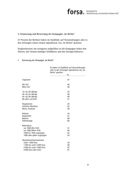 4. Bewertung der Beteiligungsmöglichkeiten an „be Berlin“ Insgesamt 56 Prozent der Berliner, insbesondere den Jüngeren und den seit 1995 Zugezogenen, gefällt das Prinzip der Beteiligung, bei dem die Berliner die Dreiklänge der Kampagne selbst bilden können. 35 Prozent der Berliner geben an, dass ihnen diese Beteiligungsmöglich- keit weniger gut (18%) oder gar nicht (17%) gefällt. Bewertung der Beteiligungsmöglichkeiten an „be Berlin“ Das Prinzip der Beteiligung, bei dem die Drei- klänge der Kampagne durch die Berliner selbst gebildet werden können, gefällt sehr gut weniger gar *) gut gut nicht % % % % insgesamt 10 46 18 17 Ost-Teil 10 46 16 18 West-Teil 10 46 18 16 14- bis 29-Jährige 14 56 14 9 30- bis 44-Jährige 12 44 18 15 45- bis 59-Jährige 8 42 19 22 60 Jahre und älter 6 43 19 20 Hauptschule 5 47 21 13 mittlerer Abschluss 7 44 19 19 Abitur, Studium 13 46 15 18 Arbeiter 9 37 22 21 Angestellte 11 51 15 18 Beamte 5 41 18 24 Selbständige 15 38 22 19 Wohndauer vor 1990 (Ost-Teil) 7 44 18 21 vor 1990 (West-Teil) 9 44 19 18 1990 bis 1994 zugezogen 12 55 18 7 1995 oder später zugezogen 15 49 14 12 Haushaltsnettoeinkommen unter 1.000 Euro 9 44 22 13 1.000 bis unter 2.000 Euro 9 46 15 20 2.000 bis unter 3.000 Euro 15 44 19 17 3.000 Euro oder mehr 11 47 19 14 *) an 100 Prozent fehlende Angaben = „weiß nicht“ 7