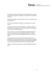 Von den verschiedenen Maßnahmen der Kampagne „be Berlin“ hat am besten das „Festival of Lights“ gefallen. 74 Prozent derjenigen, die diese Maßnahme kennen, geben an, dass ihnen das Festival sehr gut oder gut gefallen hat. Die Präsentation der Kampagne bei Sportveranstaltungen hat 64 Prozent derjenigen, die diese Maßnahme wahrgenommen haben, (sehr) gut gefal- len. Insgesamt 62 Prozent derjenigen, die bereits einmal von Fotoaktionen mit dem Erkennungszeichen der Kampagne gehört oder gesehen haben, hat diese Maßnahme gefallen. Mehrheitlich positiv beurteilen auch diejenigen, die die Bodenaufkleber auf S-Bahnstationen kennen oder den Kampagnenfilm gesehen haben, diese beiden Kampagnenmaßnahmen. Etwas weniger als der Hälfte derjenigen, die die Plakate der Kampagne oder die Radiospots kennen, haben diese Maßnahmen gefallen. Vergleichsweise am schlechtesten bewertet werden die Vorstellung der Botschafter, der Gewinnerin des Wettbewerb „Deine Botschaft für Berlin“ sowie die Postwurfsendung des Regierenden Bürgermeisters. 13