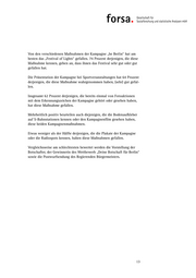 Bewertung der einzelnen Kampagnenmaßnahmen *) Es haben gefallen: sehr gut weniger gar **) gut gut nicht % % % % Das „Festival of Lights“ 31 42 7 10 Präsentation der Kampagne bei Sportveranstaltungen (z.B. bei Spielen von Hertha BSC, Alba Berlin oder beim ISTAF) 6 59 21 8 Fotoaktionen, bei denen man sich in dem Erkennungszeichen der Kampagne fotografieren lassen kann 13 49 16 11 Bodenaufkleber auf S-Bahnstationen mit allen Botschaften der Kampagne 11 47 21 17 Kampagnenfilm im Fernsehen oder im Kino 5 49 23 10 Plakate in der Stadt 5 44 31 13 Radiospots 3 45 23 13 Anzeigen und Berichte in Zeitungen oder im Internet 3 44 32 13 Vorstellung der Botschafter, die für die Kampagne stehen 9 38 20 11 Vorstellung der Gewinnerin des Wettbewerbs “Deine Botschaft für Berlin” 5 37 21 10 Postwurfsendung des Regierenden Bürgermeisters mit dem Aufruf, seine persönliche Geschichte zu erzählen 6 32 29 20 *) Basis: Diejenigen, die die jeweilige Maßnahme kennen **) an 100 Prozent fehlende Angaben = „weiß nicht“ 14