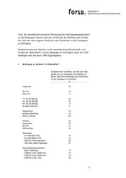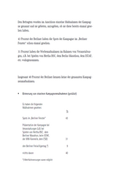Trotz der grundsätzlich positiven Bewertung der Beteiligungsmöglichkeit an der Kampagne können sich nur 18 Prozent der Berliner auch vorstel- len, sich mit einer eigenen Botschaft oder Geschichte an der Kampagne zu beteiligen. Vergleichsweise am höchsten ist die grundsätzliche Bereitschaft, sich einmal als „Botschafter“ an der Kampagne zu beteiligen, unter den Selb- ständigen und den nach 1990 Zugezogenen. Beteiligung an „be Berlin“ als Botschafter? Es können sich vorstellen, sich mit einer Bot- schaft wie „sei einzigartig, sei vielfältig, sei Berlin“ oder der Einsendung einer Geschichte an der Kampagne zu beteiligen % insgesamt 18 Ost-Teil 19 West-Teil 17 14- bis 29-Jährige 23 30- bis 44-Jährige 22 45- bis 59-Jährige 17 60 Jahre und älter 11 Hauptschule 15 mittlerer Abschluss 14 Abitur, Studium 20 Arbeiter 15 Angestellte 20 Beamte 13 Selbständige 26 Wohndauer vor 1990 (Ost-Teil) 14 vor 1990 (West-Teil) 15 1990 bis 1994 zugezogen 30 1995 oder später zugezogen 27 Haushaltsnettoeinkommen unter 1.000 Euro 17 1.000 bis unter 2.000 Euro 17 2.000 bis unter 3.000 Euro 15 3.000 Euro oder mehr 20 17