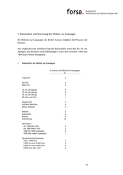7. Bekanntheit und Bewertung der Website zur Kampagne Die Website zur Kampagne „be Berlin“ kennen lediglich fünf Prozent der Berliner. Am vergleichsweise höchsten liegt die Bekanntheit unter den 30- bis 44- Jährigen, den Beamten und Selbständigen sowie den zwischen 1990 und 1994 nach Berlin Gezogenen. Bekanntheit der Website zur Kampagne Es kennen die Website zur Kampagne % insgesamt 5 Ost-Teil 5 West-Teil 5 14- bis 29-Jährige 5 30- bis 44-Jährige 9 45- bis 59-Jährige 3 60 Jahre und älter 1 Hauptschule 3 mittlerer Abschluss 4 Abitur, Studium 5 Arbeiter 5 Angestellte 6 Beamte 9 Selbständige 10 Wohndauer vor 1990 (Ost-Teil) 4 vor 1990 (West-Teil) 3 1990 bis 1994 zugezogen 9 1995 oder später zugezogen 7 Haushaltsnettoeinkommen unter 1.000 Euro 2 1.000 bis unter 2.000 Euro 3 2.000 bis unter 3.000 Euro 6 3.000 Euro oder mehr 8 18