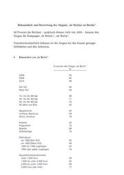 Bekanntheit und Bewertung des Slogans „be Berlin/ sei Berlin“ 68 Prozent der Berliner - praktisch ebenso viele wie 2009 - kennen den Slogan der Kampagne „be Berlin“/ „sei Berlin“. Unterdurchschnittlich bekannt ist der Slogan bei den formal geringer Gebildeten und den Arbeitern. " Bekanntheit von „be Berlin" Es kennen den Slogan „be Berlin“ 0% 2008 56 2009 69 2010 68 Ost-Teil 66 West-Teil 69 14- bis 29-Jährige 68 30- bis 44-Jährige 71 45- bis 59-Jährige 70 60 Jahre und älter 63 Hauptschule 40 mittlerer Abschluss 58 Abitur, Studium 79 Arbeiter 55 Angestellte 75 Beamte 88 Selbständige 74 Wohndauer vor 1990 (Ost-Teil) 63 vor 1990 (West-Teil) 69 1990 bis 1994 zugezogen 63 1995 oder später zugezogen 74 Haushaltsnettoeinkommen unter 1.000 Euro 59 1.000 bis unter 2.000 Euro 65 2.000 bis unter 3.000 Euro 68 3.000 Euro oder mehr 77