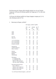 Die Bewertung des Slogans fällt ebenfalls ähnlich aus wie im Vorjahr: insgesamt 44 Prozent der Berliner gefällt der Slogan gut (37 %) oder sehr gut (7 %). 50 Prozent der Berliner gefällt der Slogan dagegen weniger gut (23 %) oder überhaupt nicht (27 %). = Bewertung des Slogans „be Berlin" Der Slogan „be Berlin“ gefällt sehr gut weniger gar *) gut gut nicht N % % 2008 4 27 23 35 2009 7 36 24 28 2010 7 37 23 27 Ost-Teil 5 36 25 26 West-Teil 7 38 22 27 14- bis 29-Jährige 13 50 19 13 30- bis 44-Jährige 7 40 26 21 45- bis 59-Jährige 5 36 22 32 60 Jahre und älter 2 25 24 38 Hauptschule 4 37 15 30 mittlerer Abschluss 3 35 28 27 Abitur, Studium 8 35 24 27 Arbeiter 3 42 16 29 Angestellte 7 44 20 23 Beamte 2 40 25 30 Selbständige 9 32 21 35 Wohndauer vor 1990 (Ost-Teil) 4 32 26 31 vor 1990 (West-Teil) 7 35 21 30 1990 bis 1994 zugezogen 7 45 24 18 1995 oder später zugezogen 10 45 21 18 Haushaltsnettoeinkommen unter 1.000 Euro 10 32 27 23 1.000 bis unter 2.000 Euro 5 39 20 28 2.000 bis unter 3.000 Euro 7 37 27 23 3.000 Euro oder mehr 9 40 22 25 *) an 100 Prozent fehlende Angaben = „weiß nicht"